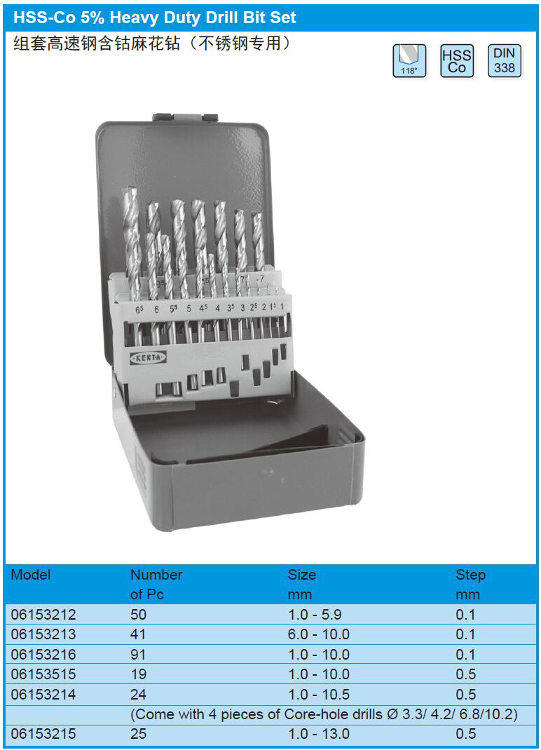 19件套装高速钢含钴麻花钻(不锈钢专用)