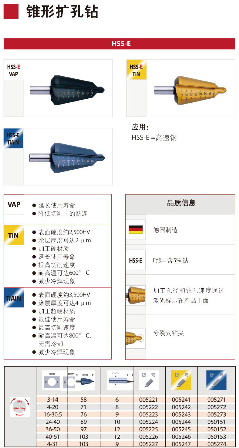 ·德国制造; ·E级=含5%钴; ·加工孔径和钻孔速度通过激光标示在产品上; ·分裂式钻尖 ·材质:HSS-E; ·延长使用寿命; ·降低切削中的黏连