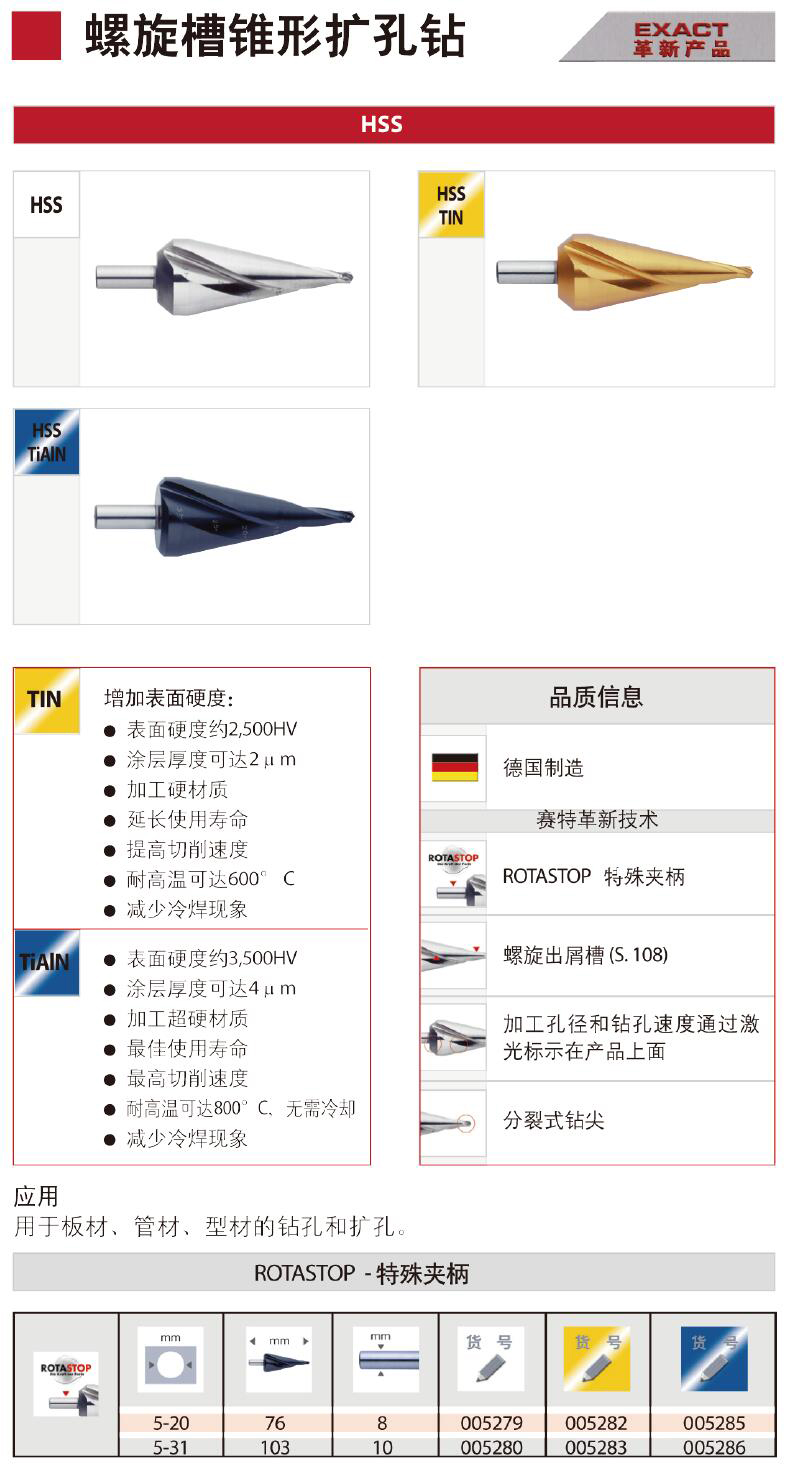 ·材质:HSS ·德国制造; ·ROTASTOP特殊夹柄; ·螺旋出屑槽(S.108)加工孔径和钻孔速度通过激光标示在产品上; ·分裂式钻尖