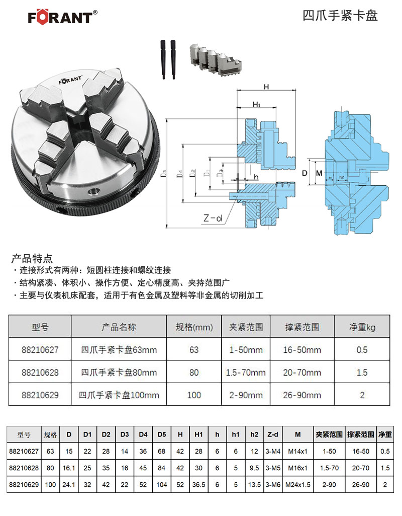 ·连接形式有两种:短圆柱连接和螺纹连接 ·结构紧凑、体积小、操作方便、定心精度高、夹持范围广 ·主要与仪表机床配套,适用于有色金属及塑料等非金属的切削加工