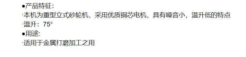 ·本机为重型立式砂轮机,采用优质铜芯电机,具有噪音小,温升低的特点