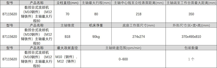 订货号 制造商型号 最大攻丝直径 立柱直径 主轴最大行程 主轴轴线至立柱表面距离 主轴端至工作台面最大距离 主轴端至底座最大距离 主轴锥度 主轴转速范围 底座工作面尺寸 电动机功率 额定电压 净重 包装数量 价格 购物车