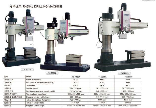 订货号 制造商型号 最大钻孔直径 主轴中心到立柱母线距离 主轴最大行程 主轴锥度 主轴转速范围 主电动机功率 毛重/净重 工作台面尺寸 立铣直径 立方工作台尺寸 主轴至工作台最大距离 钻头行程 摇臂行程 外形尺寸 价格 购物车