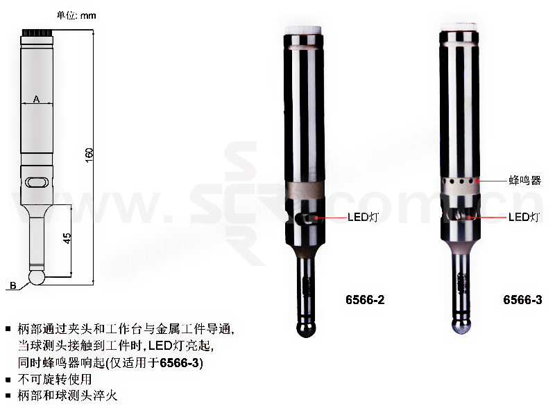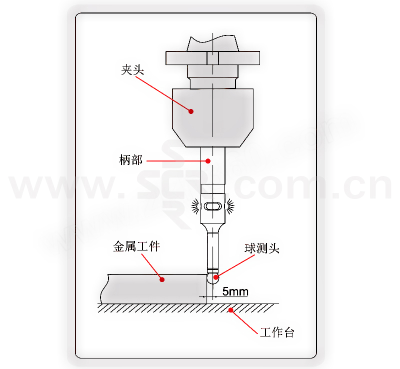 ·柄部通过夹头和工作台与金属工件导通,当球测头接触到工件时,LED灯亮起。1v4893LED灯亮起,同时蜂鸣器响起。