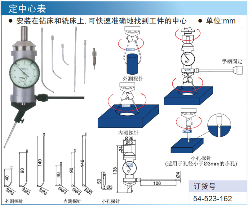 ·安装在钻床和铣床上,可快速准确地找到工件的中心·单位:mm