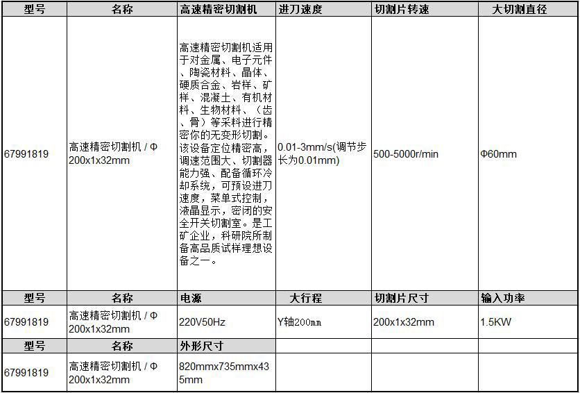 ·高速精密切割机适用于对金属、电子元件、陶瓷材料、晶体、硬质合金、岩样、矿样、混凝土、有机材料、生物材料、(齿、骨)等采料进行精密你的无变形切割。 ·该设备定位精密高,调速范围大、切割器能力强、配备循环冷却系统,可预设进刀速度,菜单式控制,液晶显示,密闭的安全开关切割室。是工矿企业,科研院所制备高品质试样理想设备之一。