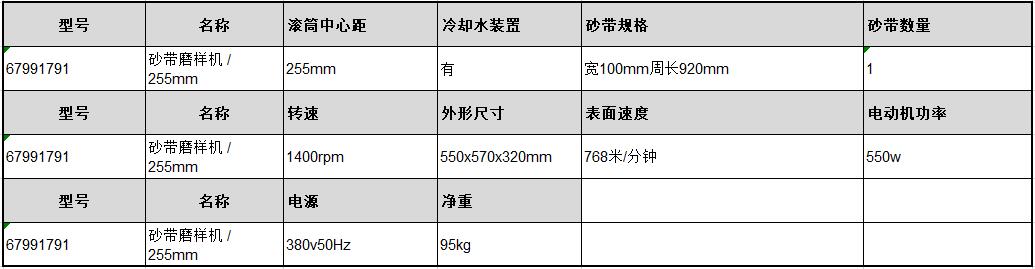 订货号 制造商型号 砂纸直径 转速 输入电压 功率 尺寸 重量 滚筒中心距 冷却水装置 砂带数量 表面速度 价格 购物车