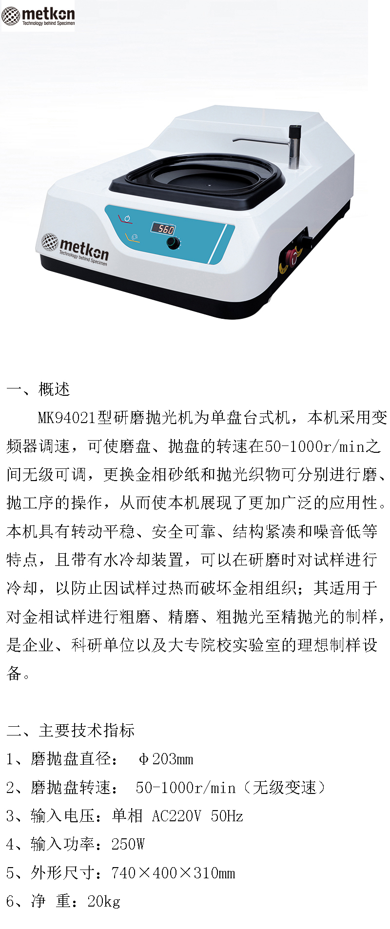 ·金相试样磨抛机为单盘台式机,具备磨抛盘旋转方向可任意选择。本机采用了先进的微处理器控制系统,更换金相砂纸和抛光织物可分别进行磨、抛工序的操作从而使本机展现了更加广泛的应用性。本机具有转动平稳、安全可靠、结构紧凑和噪音低等特点;且带有水冷却装置,可以在研·磨时对试样进行冷却,以防止因试样过热而破坏金相组织,是企业、科研单位以及大专院校实验室的理想制样设备。