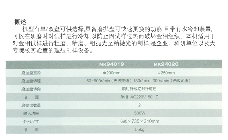 E14020 MK94020 工作盘φ250mm 50~600r/min(无级调速)150r/min 300r/min 220V 50HZ 500W 690×735×310mm 55kg 60000.00