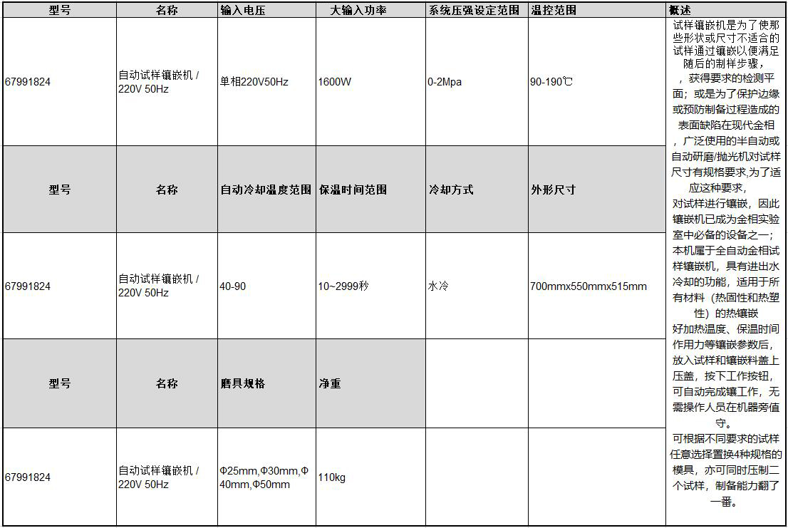 ·试样镶嵌机是为了使那些形状或尺寸不适合的试样通过镶嵌以便满足随后的制样步骤,获得要求的检测平面; ·或是为了保护边缘或预防制备过程造成的表面缺陷在现代金相,广泛使用的半自动或自动研磨/抛光机对试样尺寸有规格要求,为了适应这种要求,必对试样进行镶嵌,因此镶嵌机已成为金相实验室中必备的设备之一; ·本机属于全自动金相试样镶嵌机,具有进出水冷却的功能,适用于所有材料(热固性和热塑性)的热镶嵌好加热温度、保温时间作用力等镶嵌参数后,放入试样和镶嵌料盖上压盖,按下工作按钮,可自动完成镶工作,无需操作人员在机器旁值守。 ·可根据不同要求的试样任意选择置换4种规格的模具,亦可同时压制二个试样,制备能力翻了一番。