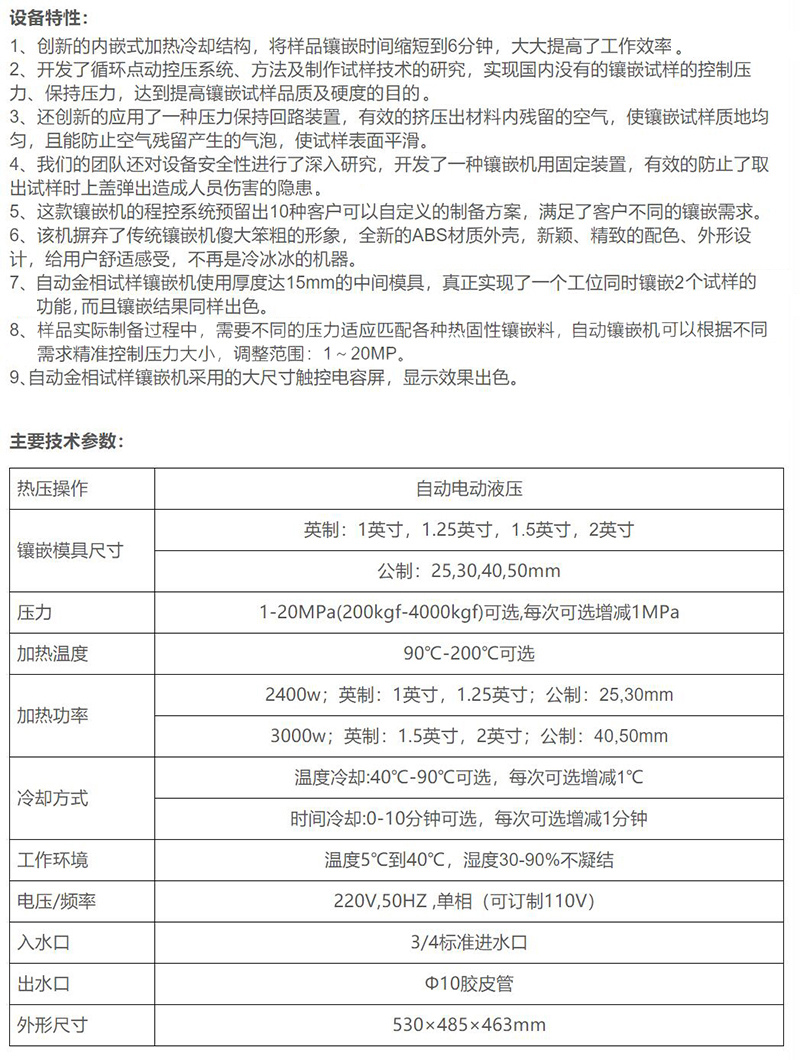 ·创新的内嵌式加热冷却结构,将样品镶嵌时间缩短到6分钟,大大提高了工作效率。