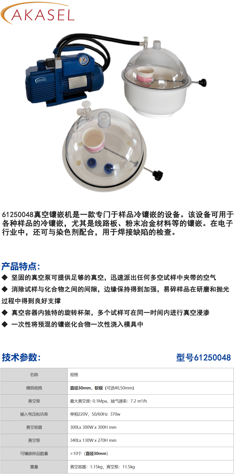 ·通过对样品和镶嵌树脂抽真空 ·可除去样品和镶嵌树脂中的气体 ·样品中的空洞将可被镶嵌树脂填充 ·样品和镶嵌树脂之间不出现缝隙 ·该设备紧凑、快速、使用方便 ·可同时镶嵌6个直径为30mm的样品