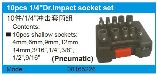 10个浅冲击套筒: 4mm,6mm,9mm,12mm, 14mm,3/16“,1/4”,3/8“, 1/2“,9/16”