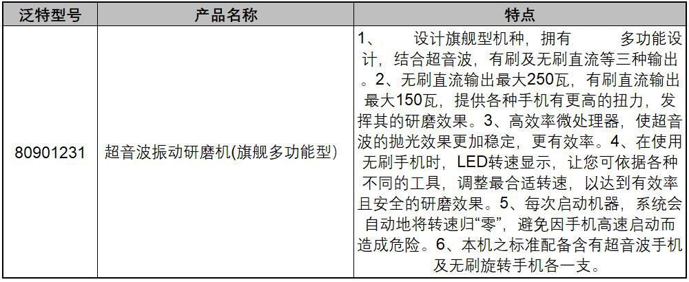 ·全新设计旗舰型机种,拥有最先进的多功能设计,结合超音波,有刷及无刷直流等三种输出。 ·无刷直流输出最大250瓦,有刷直流输出最大150瓦,提供各种手机有更高的扭力,发挥其最佳的研磨效果。 ·先进的高效率微处理器,使超音波的抛光效果更加稳定,更有效率。 ·在使用无刷手机时,LED转速显示,让您可依据各种不同的工具,调整最合适转速,以达到最有效率且安全的研磨效果。 ·每次启动机器,系统会自动地将转速归“零”,避免因手机高速启动而造成危险。 ·本机之标准配备含有超音波手机(GS-H26)及无刷旋转手机(U-L