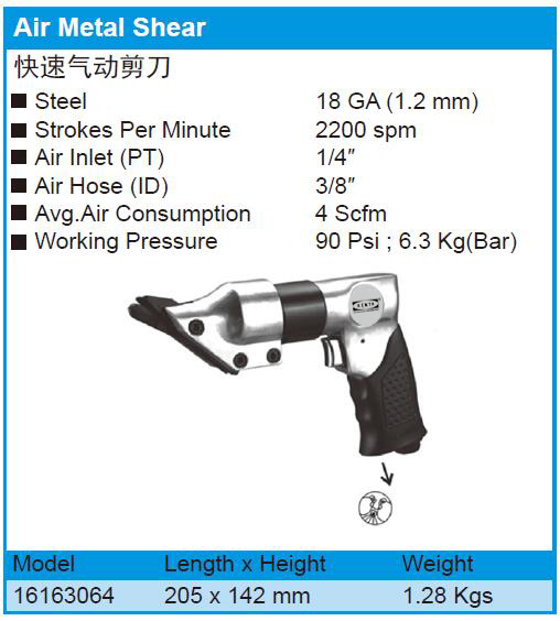 ·每分钟18GA(1.2mm)钢行程2200spm进气口(PT)1/4“空气软管(ID)3/8”平均耗气量4Scfm工作压力90Psi;6.3Kg(巴)