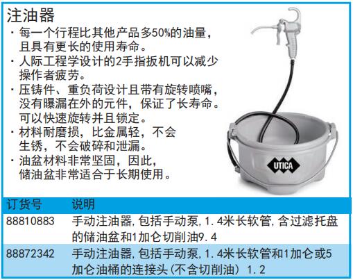 ·手动注油器,包括手动泵,1.4米长软管,含过滤托盘的储油盆和1加仑切削油9.4 ·每一个行程比其他产品多50%的油量,且具有更长的使用寿命。 ·人际工程学设计的2手指扳机可以减少操作者疲劳。 ·压铸件、重负荷设计且带有旋转喷嘴,没有曝漏在外的元件,保证了长寿命。可以快速旋转并且锁定。 ·材料耐磨损,比金属轻,不会生锈,不会破碎和泄漏。 ·油盆材料非常坚固,因此,储油盆非常适合于长期使用。