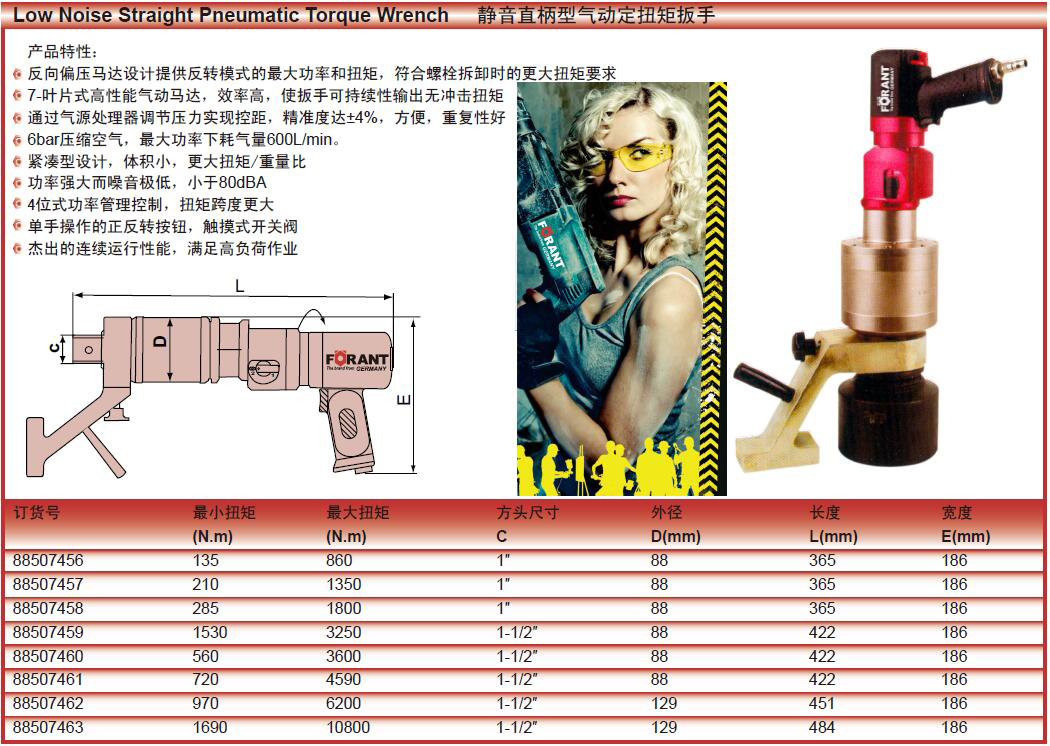 ·反向偏压马达设计提供反转模式的最大功率和扭矩,符合螺栓拆卸时的更大扭矩要求 ·7-叶片式高性能气动马达,效率高,使扳手可持续性输出无冲击扭矩 ·通过气源处理器调节压力实现控距,精准度达±4%,方便,重复性好 ·6bar压缩空气,最大功率下耗气量600L/min。 ·紧凑型设计,体积小,更大扭矩/重量比 ·功率强大而噪音极低,小于80dBA ·4位式功率管理控制,扭矩跨度更大 ·单手操作的正反转按钮,触摸式开关阀 ·杰出的连续运行性能,满足高负荷作业
