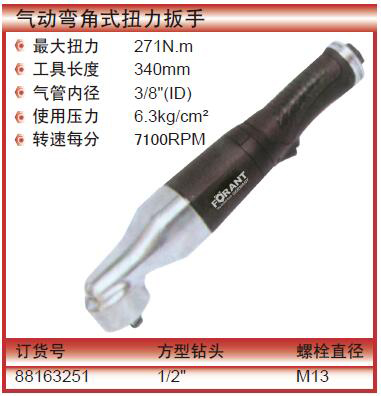 ·最大扭力271N.m ·工具长度340mm ·气管内径3/8"(ID) ·使用压力6.3kg/cm² ·转速每分7100RPM