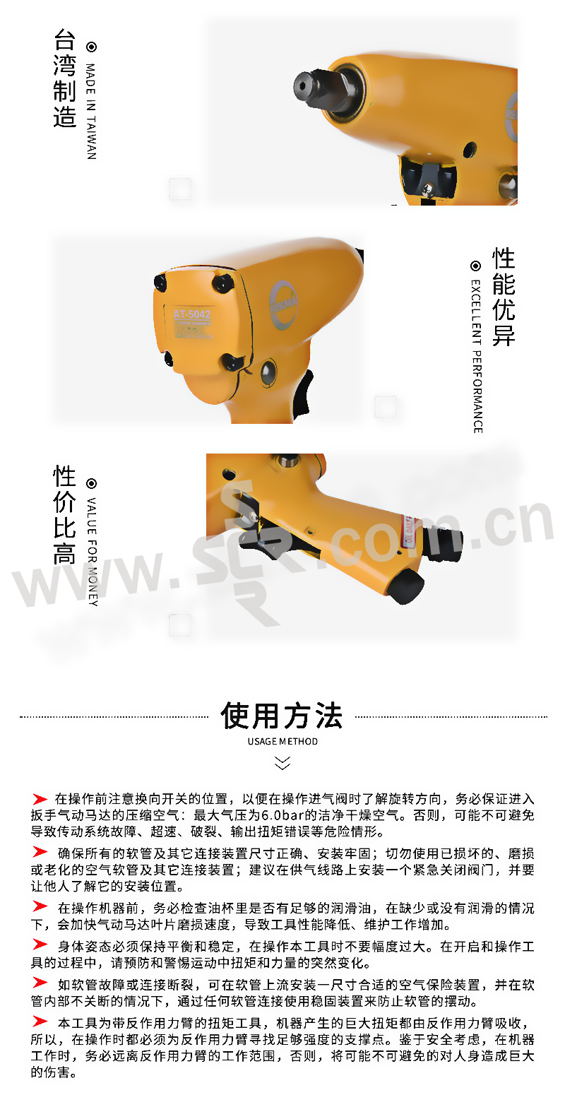 REKMA/锐克马 1/2" 气动冲击扳手(冲击销) AT-5042 1/2" M13;9,000RPM;257.6 N.m 1把