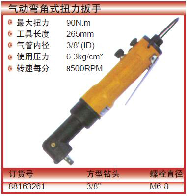 ·最大扭力90N.m ·工具长度265mm ·气管内径3/8"(ID) ·使用压力6.3kg/cm² ·转速每分8500RPM