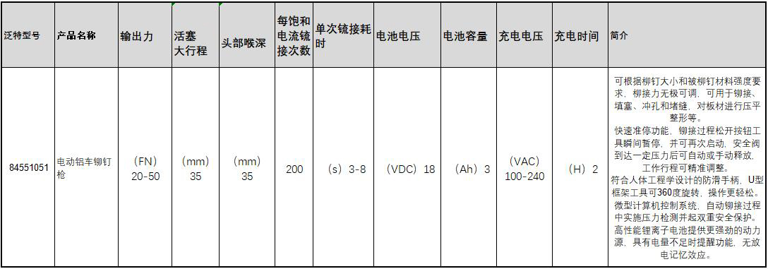 ·可根据柳钉大小和被柳钉材料强度要求,柳接力无极可调,可用于铆接、填塞、冲孔和堵缝,对板材进行压平整形等。 ·快速准停功能,铆接过程松开按钮工具瞬间暂停,并可再次启动,安全阀到达一定压力后可自动或手动释放,工作行程可精准调整。 ·符合人体工程学设计的防滑手柄,U型框架工具可360度旋转,操作更轻松。 微型计算机控制系统,自动铆接过程中实施压力检测并起双重安全保护。 ·高性能锂离子电池提供更强劲的动力源,具有电量不足时提醒功能,无放电记忆效应。