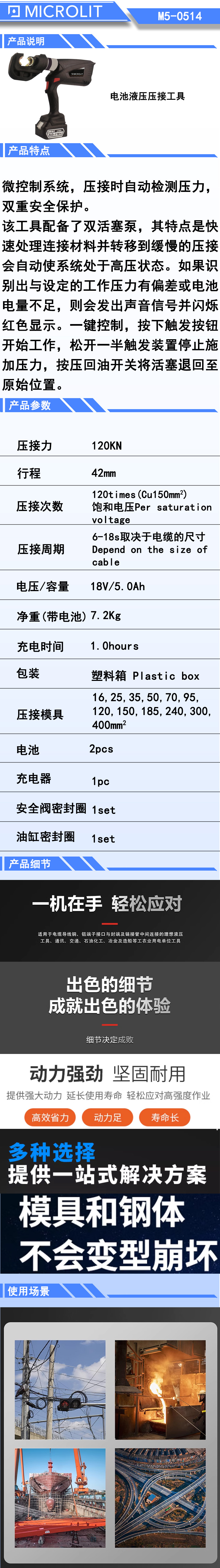 * 可选配6款功能钳头,用于压接、剪切、开孔。 * 微控制系统,压接时自动检测压力,双重安全保护。* 该工具配备了双活塞泵,其特点是快速处理连接材料并转移到缓慢的压接会自动使系统处于高压状态 * 如果识别出与设定的工作压力有偏差或电池电量不足,则会发出声音信号并闪烁红色显示。 * 一键控制,按下触发按钮开始工作,松开一半触发装置停止施加压力,按压回油开关将活塞退回至原始位置。 * 温度传感器使工具自动停止工作,当长时间工作温度超过60℃时,故障信号响起,这意味着工具必须等到温度降至正常水平才能继续工作。 * 一键控制连续使用功能一一功能1:按下触发器开始工作,松开触发器意味着停止加压,继续增加压力,直到跳压活塞返回初始位置。功能2:按下触发器开始工作,松开触发器意味着停止加压,继续加大压力跳压活塞回位,按下引发活塞回到停止,继续按下开关机进入新的加压工作。功能3:按下扳机开始工作,松开扳机表示停止加压,继续加压压力上升后跳按扳机后停止后退,继续按压扳机后跳不放扳机活塞自动停止后回到最后一个停止位,可选择任意大小位置两次在未放扳机自动停止位置选择。