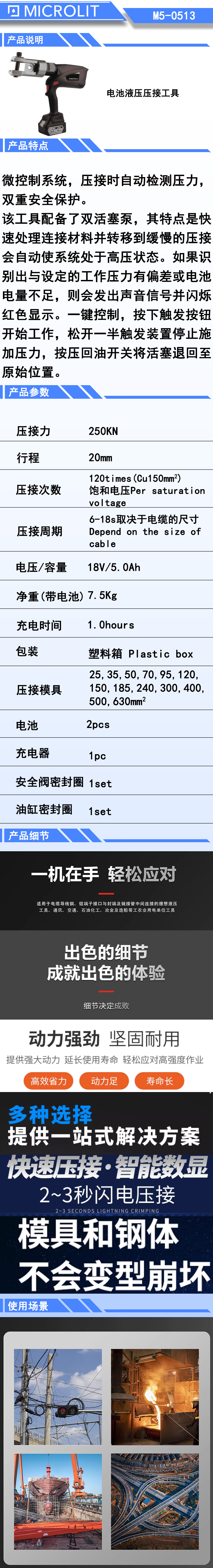 K29715 M5-0513 20mm 250KN 120times(Cu150m㎡)饱和电压 6-18s取决于电缆的尺寸 18V/5.0Ah 1.0hours 塑料箱 8415.00