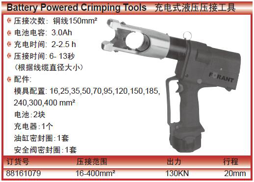 ·压接次数:铜线150mm² ·电池电容:3.0Ah ·充电时间:2-2.5h ·压接时间:6-13秒 ·(根据线缆直径大小) ·配件: ·模具配置:16,25,35,50,70,95,120,150,185,240,300,400mm² ·电池:2块 ·充电器:1个 ·油缸密封圈:1套 ·安全阀密封圈:1套