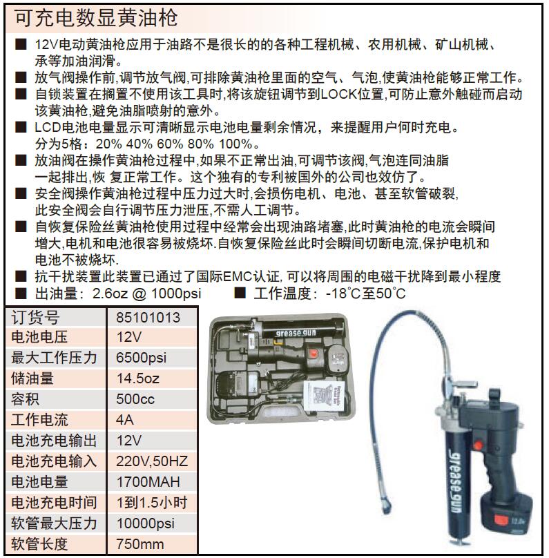 ·安全阀操作黄油枪过程中压力过大时,会损伤电机、电池、甚至软管