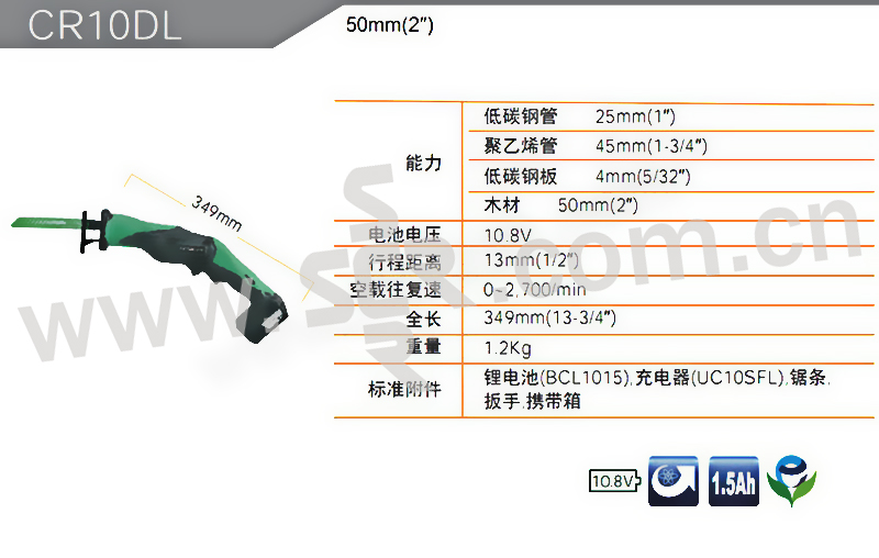 ·插入式单电池1。5Ah,调速·紧凑轻巧, 机身纤细·扳机调速适合各种材料的加工·免工具快速锯片更换结构·20mm 滑动式机座·1。5Ah 锂电池 (轻量, 长寿)·充电提示灯· LED 照明·锂电池 (BCL1015),充电器 (UC10SFL), 携带箱, 锯片, 扳手