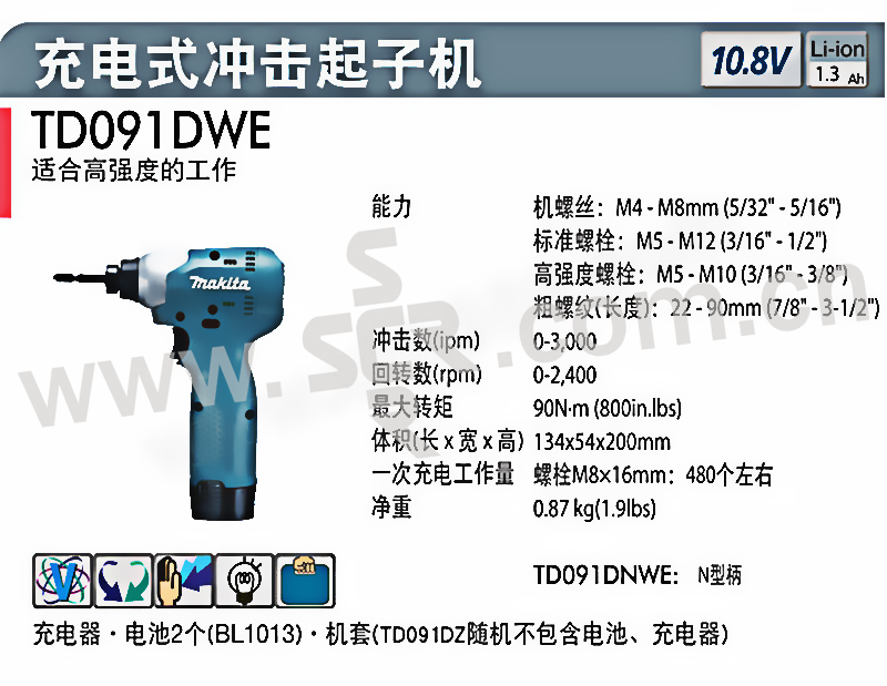 MAKITA/牧田 锂电充电式冲击螺丝批 TD091DNWE 包含两电一充 10.8V/1.3Ah 1把