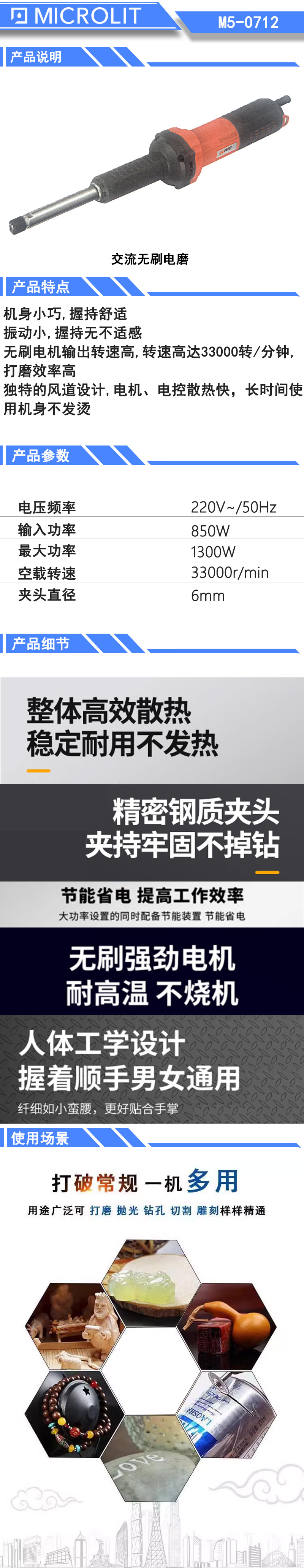 * 机身小巧,握持舒适 * 振动小,握持无不适感 * 无刷电机输出转速高,转速高达33000转/分钟,打磨效率 高 * 独特的风道设计,电机、电控散热快、长时间使用机身不发烫