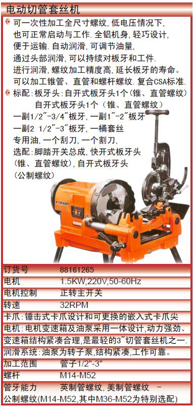 ·可一次性加工全尺寸螺纹·低电压情况下, 也可正常启动与工作·全铝机身,轻巧设计, 便于运输.自动润滑,可调节油量, ·通过头部润滑,可以持续对板牙和工件. ·进行润滑,螺纹加工精度高,延长板牙的寿命。