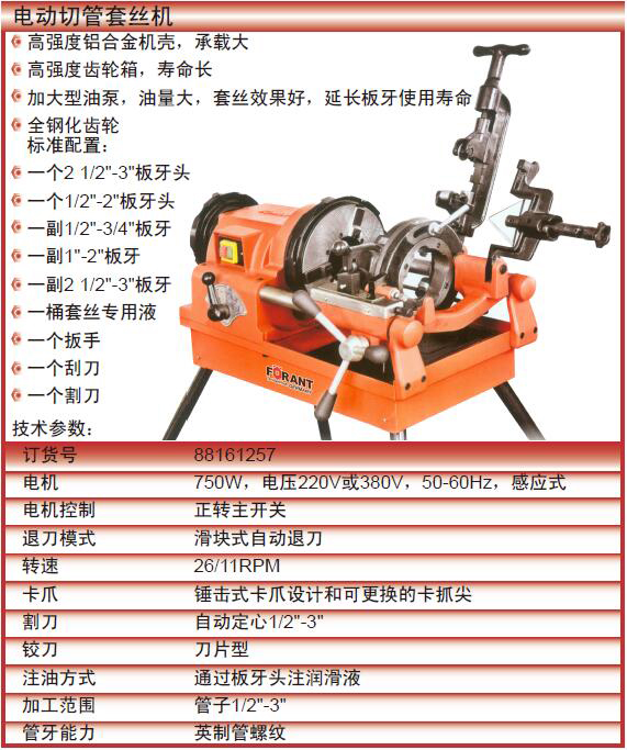 ·高强度铝合金机壳,承载大 ·高强度齿轮箱,寿命长 ·加大型油泵,油量大,套丝效果好,延长板牙使用寿命