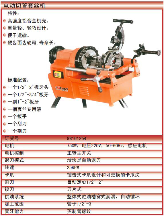 ·高强度铝合金机壳。 ·重量轻、轻巧设计。 ·便于运输。 ·硬齿面齿轮箱,寿命长。 ·高强度铝合金机壳。 ·大功率电机,确保套丝一次完成。 ·全钢化齿轮。