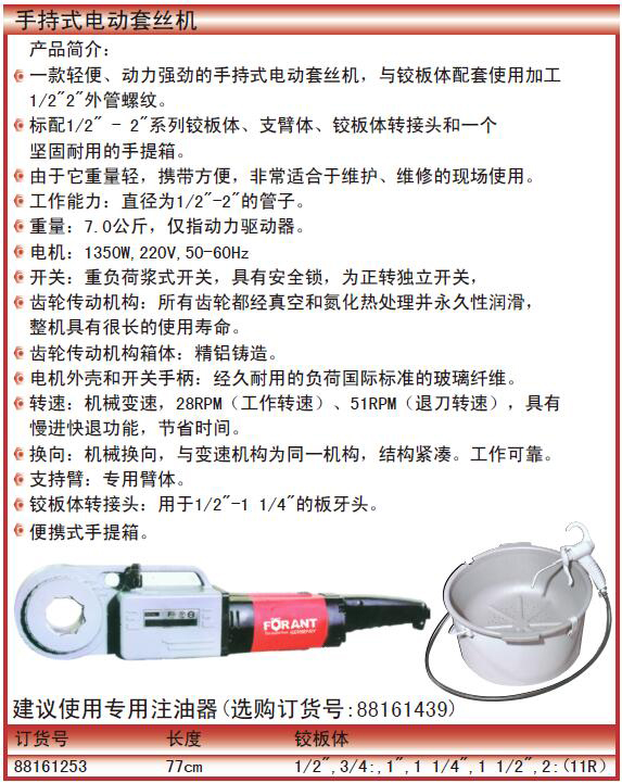 ·一款轻便、动力强劲的手持式电动套丝机,与铰板体配套使用加工 1/2"2"外管螺纹。 ·由于它重量轻,携带方便,非常适合于维护、维修的现场使用。