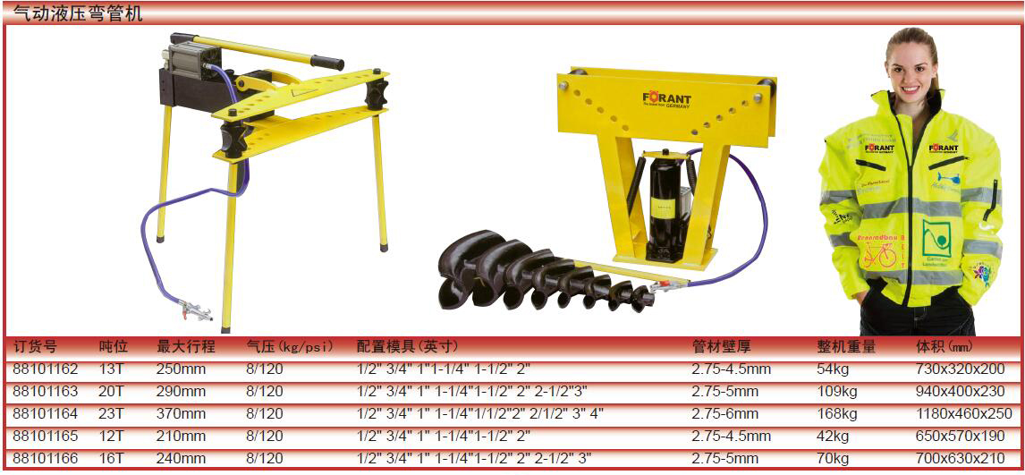 订货号 制造商型号 最大工作压力 最大工作行程 弯管能力 弯管角度 曲率半径 液压油牌号 整机重量 包装尺寸 管材壁厚 配置摸具(英寸) 气压(kg/psi) 价格 购物车