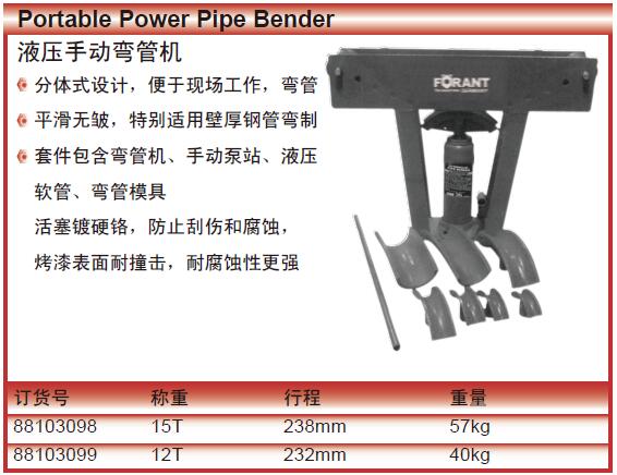 ·分体式设计,便于现场工作,弯管 平滑无皱,特别适用壁厚钢管弯制 套件包含弯管机、手动泵站、液压 软管、弯管模具 ·活塞镀硬铬,防止刮伤和腐蚀, ·烤漆表面耐撞击,耐腐蚀性更强