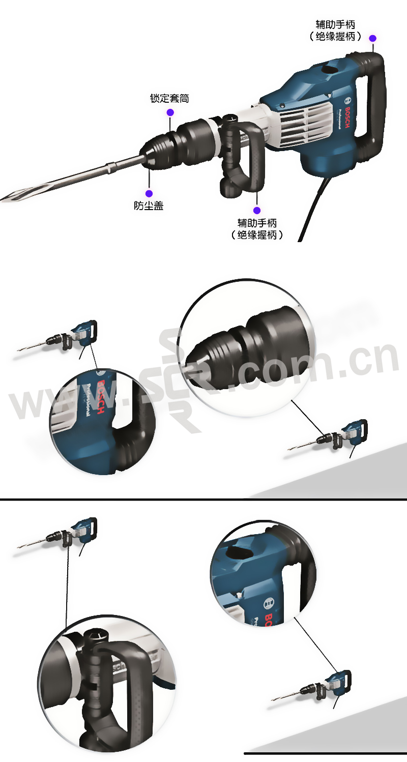 ·由于具备纵列式外形,使其操控性好,适合从上至下的应用 ·由于具有带减振主手柄和辅助手柄的振动控制以及AV冲击机构,允许的日常使用时间(ELV)更长 ·由于工作状态显示屏提前显示需要更换的碳刷,减少停工时间 ·由于配备带冲击率预选功能的转速表盘,可适用于广泛的应用 ·归因于带12个位置的可变锁紧件,总是处在工作位置 ·开关容易触及,在操作过程中无需放开手柄 ·由于配备1700瓦的电机和2
