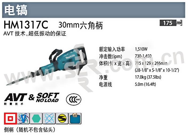 ·HM0810T 强劲马力,坚固耐用,机型小巧,三者组合!滑动式夹头,更换凿子更快 ·HM1304 30mm六角锥柄,低噪音,低振动,马力强劲,性能更卓越 ·HM1307C 坚固耐用,拆除性能优异 ·HM1317C AVT技术,超低震动保证 ·HM1801 28。6mm六角锥柄 同类产品种马力强,性能卓越 ·HM1810 最低的震动!效率高 ·HM0810TA 坚固耐用,拆除性能优异