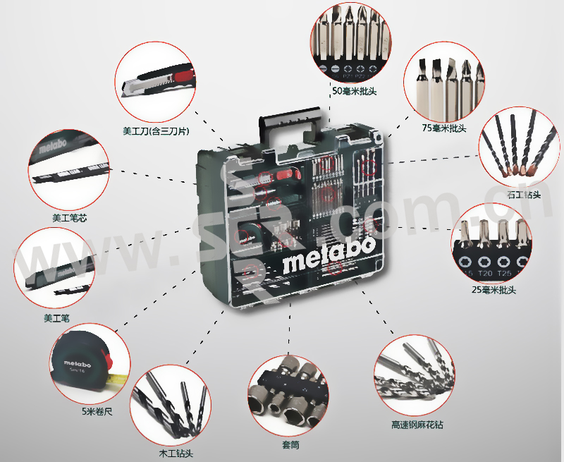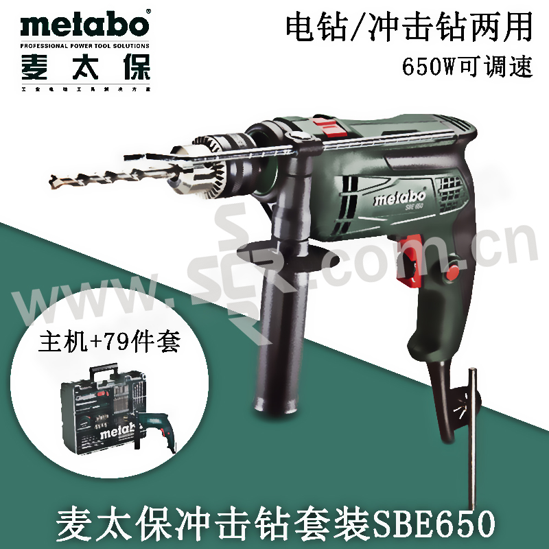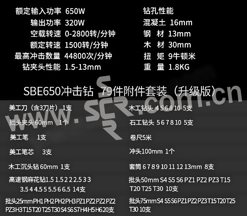 ·坚固的铝合金齿轮箱,侧下方的出风口引导气流向前方排除,避免空气中的灰尘飞入眼睛。 ·无级调速开关可准确设定至最佳工作转速。 ·MVT减震手柄。 ·旋转式的碳刷架在正反转时都能保持相同动力。 ·相比起传统的保护套,球形电线保护套使弯曲更灵活,更不会折断。 ·包含79件套常用工具及各类批头和钻头。