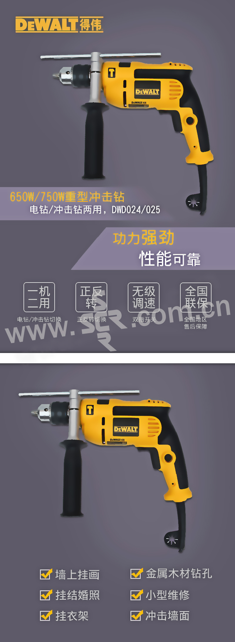 DEWALT/得伟 13mm 650W 冲击钻 DWD024 调速13mm650W 1台