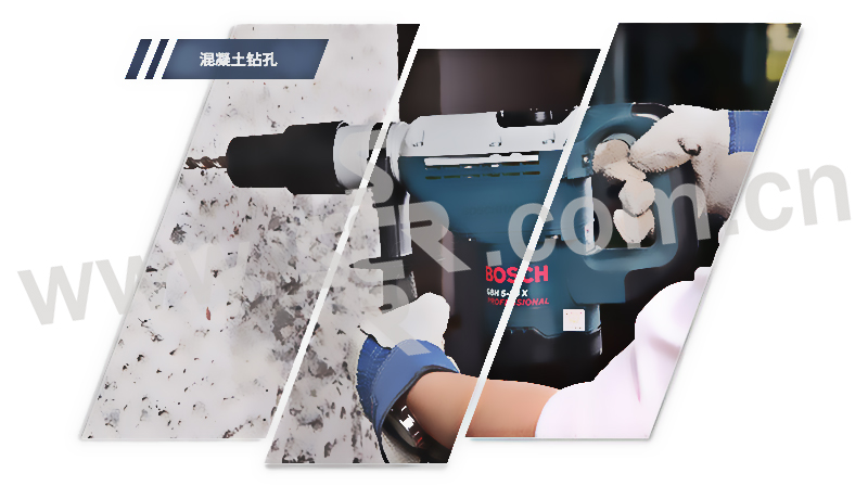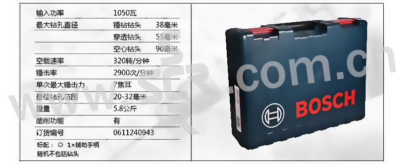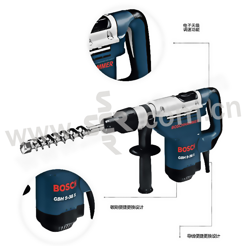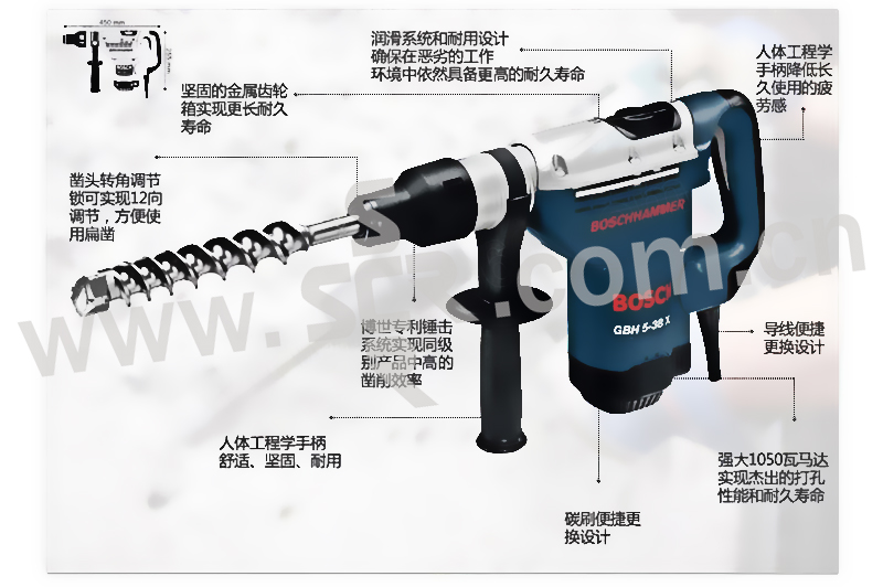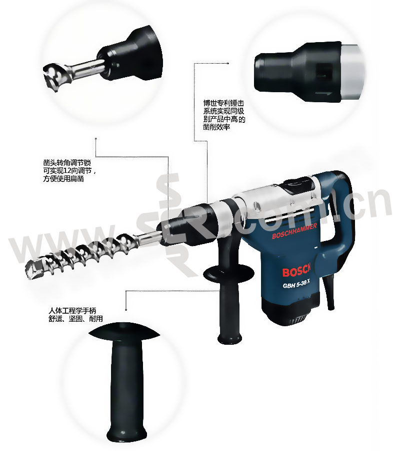 ·最大钻孔直径达到38毫米 ·具有普遍适用的削凿功能 ·得益于坚硬的金属壳体和紧凑型设计,即使在重负荷应用中也具有很长的使用寿命 ·强劲的1050瓦马达 ·得益于改进的锤击机构技术,在混凝土中钻孔时也具有高的钻孔速率 ·凿头转角调节锁,带有12个不同的凿子位置 ·配有维修盖,可方便更换碳刷