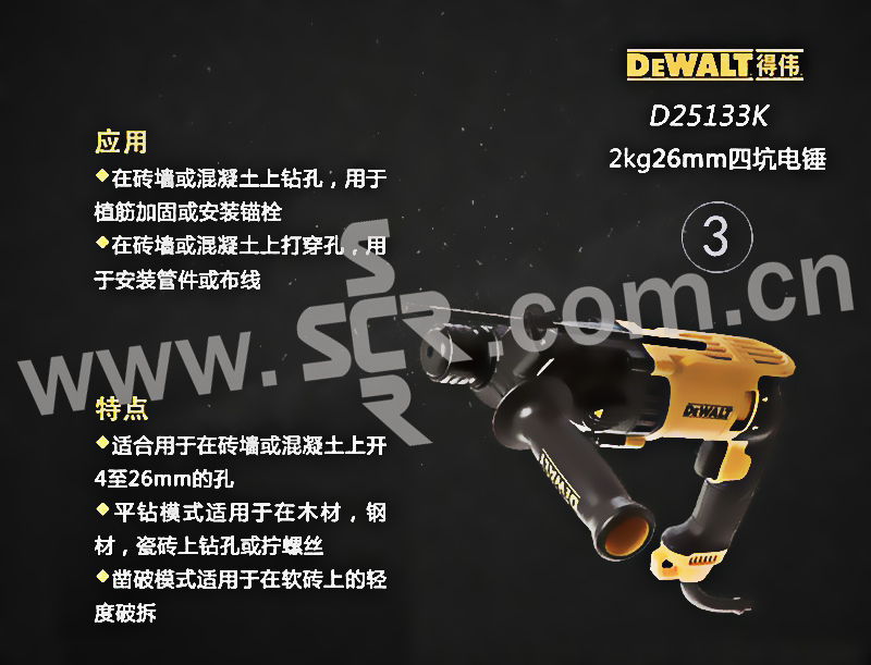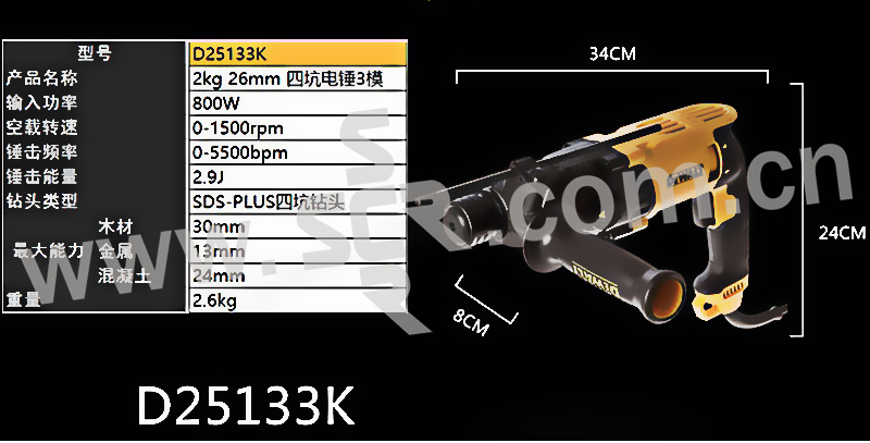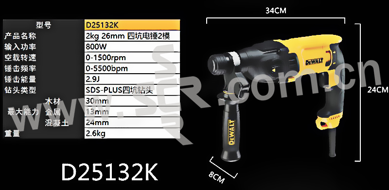 DEWALT/得伟 26mm 2模 800W 四坑电锤 D25132K 26mm 2模 1台