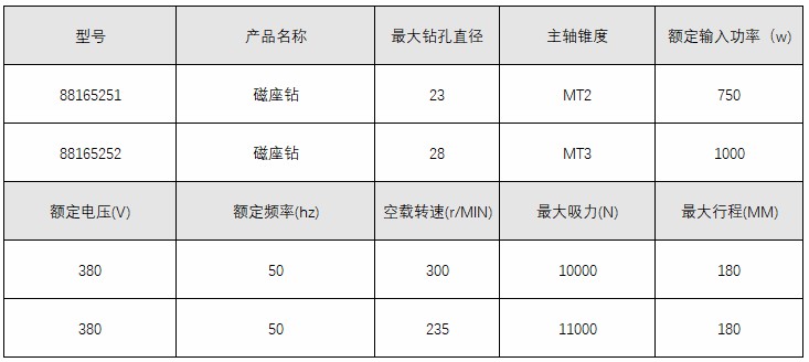 订货号 制造商型号 电压 输入功率 夹头规格 行程 扭矩 钻孔直径 空载转速 额定转速 磁铁吸持力 重量 标准附件 主轴锥度 额定频率 价格 购物车