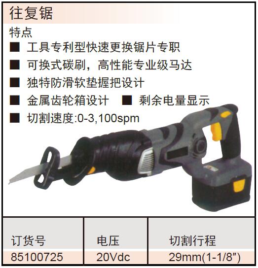 ·工具专利型快速更换锯片专职 ·可换式碳刷,高性能专业级马达 ·独特防滑软垫握把设计 ·金属齿轮箱设计 ·剩余电量显示 ·切割速度:0-3,100spm
