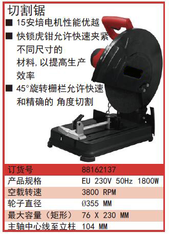 ·15安培电机性能优越 ·快锁虎钳允许快速夹紧不同尺寸的材料,以提高生产效率 ·45°旋转栅栏允许快速和精确的角度切割