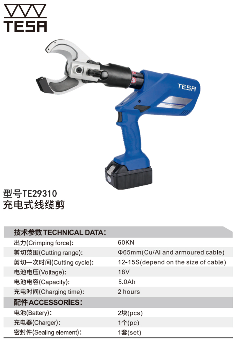 LX107868 TE29314 电池:2块 充电器:1个 密封件:1套 250KN 120mm以下铜铝电缆,高压3×500,低压5×400以下电缆 12~20S 18V 5.0Ah 2hours 9920.00