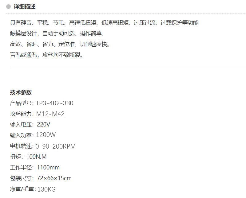 订货号 制造商型号 额定输入功率 空载转速 攻丝范围 净重 价格 购物车
