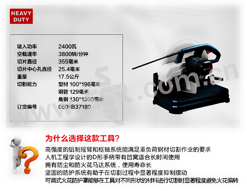 ·强度的铝制摇臂和枢轴系统能满足重负荷钢材切割作业的要求。·人机工程学设计的D形手柄带有凹窝,适合长时间使用。·拥有防尘和防火花马达系统,使用寿命长。·坚固的防护系统有助于在切割过程中显著程度抑制摆动。·可调式火花防护罩能够在工具对不同形状的材料进行切割时显著程度避免火花偏转。